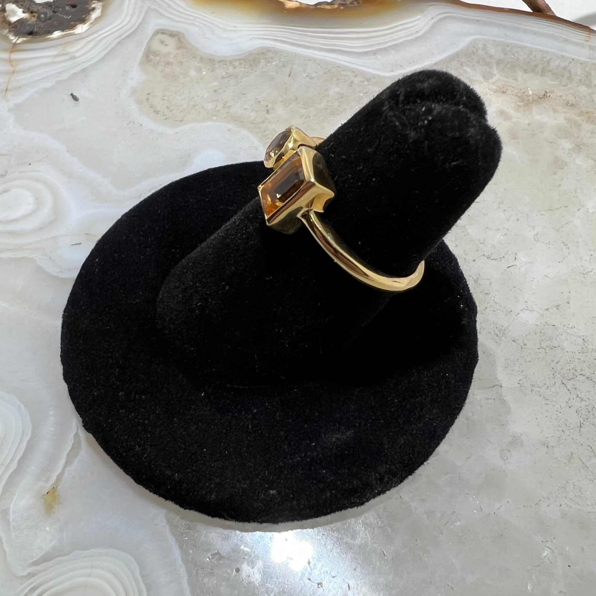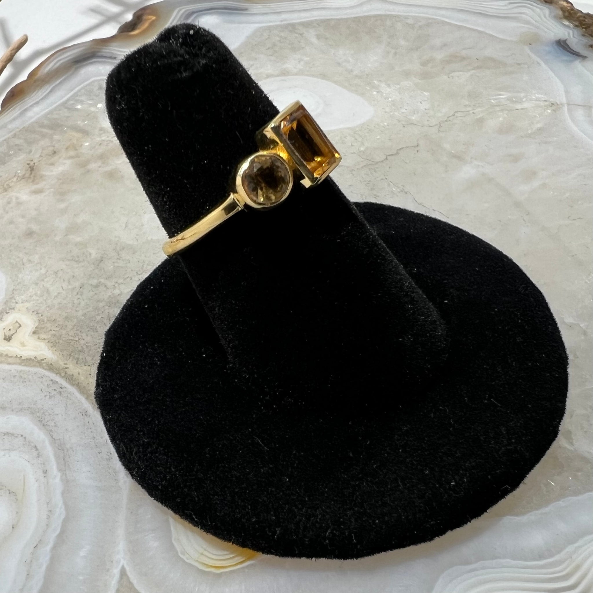 Bright, balanced, and thoughtfully designed, this dual-stone citrine ring is crafted in 18k gold-plated 925 sterling silver, pairing two faceted citrine gemstones in a harmonious composition. One round and one rectangular citrine are each set in classic bezel settings, creating a striking contrast of shape while maintaining a cohesive, refined look.