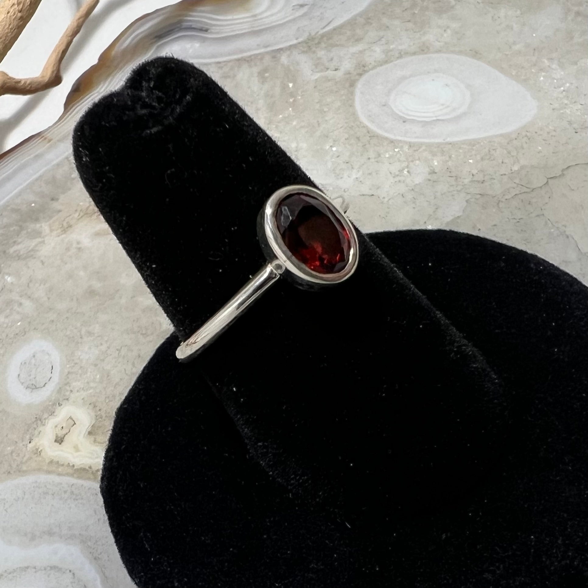 A clean, modern design that pairs the warm fire of a faceted oval garnet with the understated elegance of a minimalist silver band—perfect for those who love simplicity infused with depth and meaning.