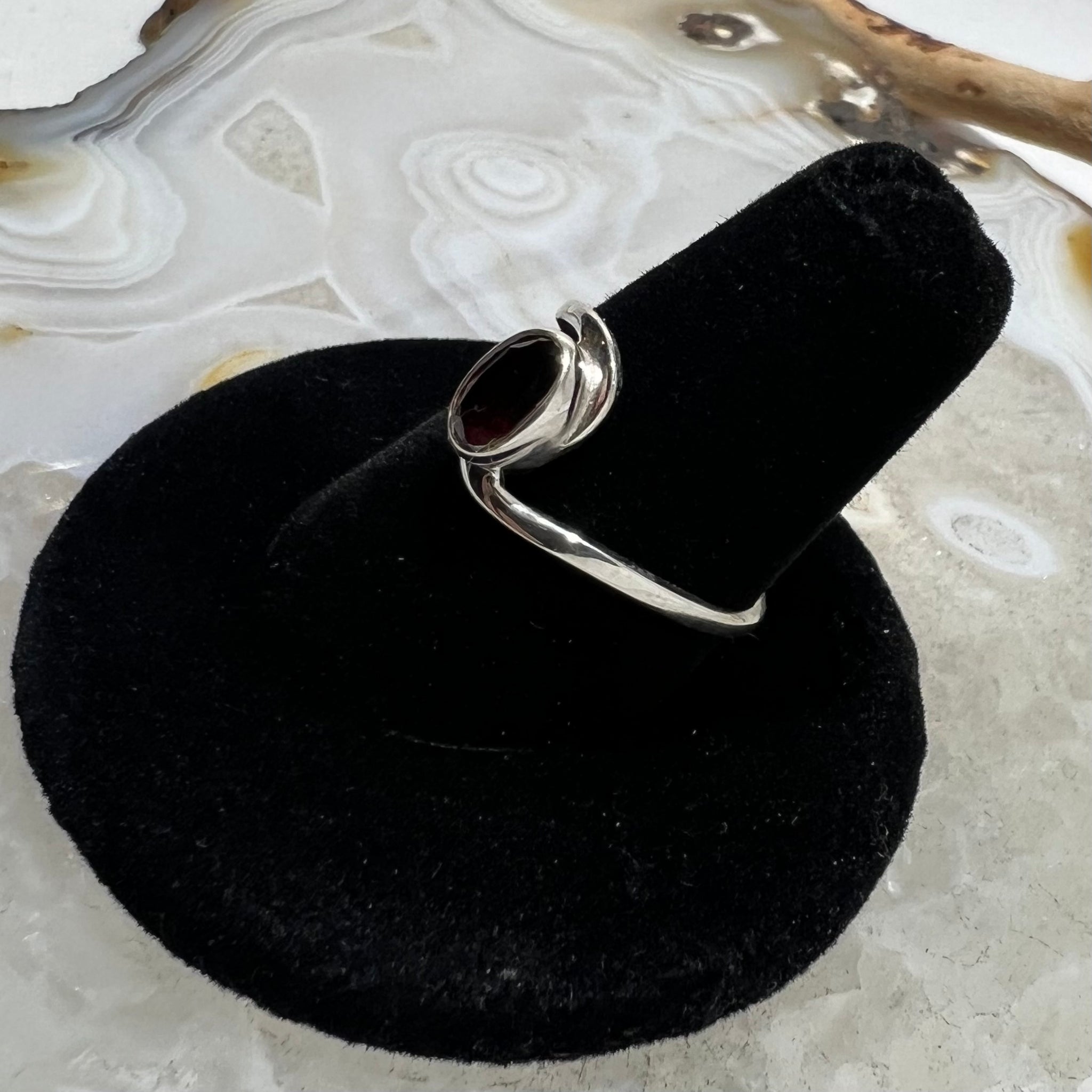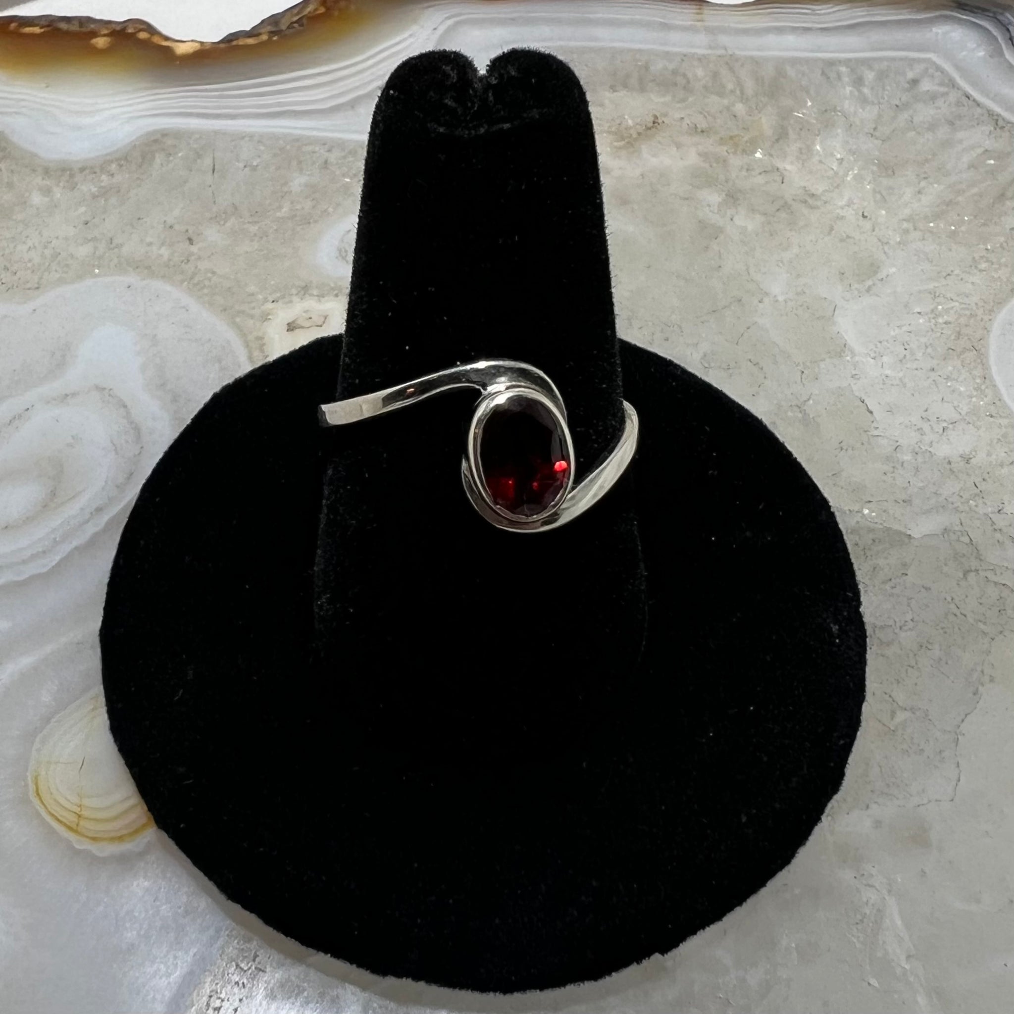 Timeless and refined, this oval faceted garnet ring is crafted in 925 sterling silver and features a classic band with a graceful wrap-style setting that curves around the top and bottom of the garnet, cradling the gem securely while adding an elegant sculptural touch.