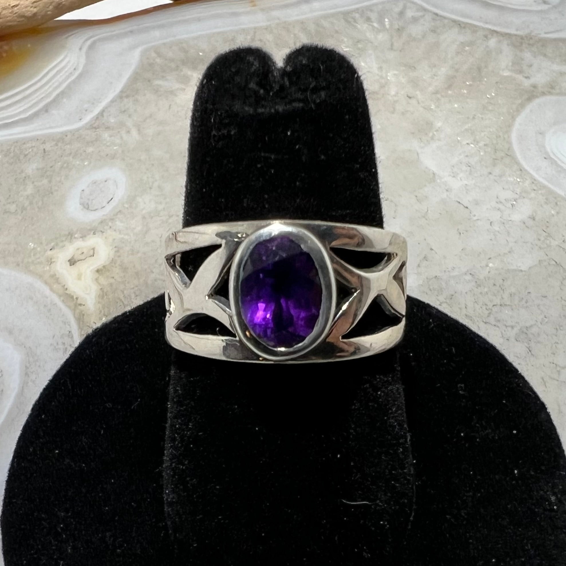 Timeless and refined, this oval faceted amethyst ring is crafted in 925 sterling silver and features a bold wide band with artistic cut-out detailing, adding depth, texture, and distinctive character. The stone is securely bezel set, giving it a smooth, modern finish while beautifully framing the amethyst and enhancing its luminous glow.