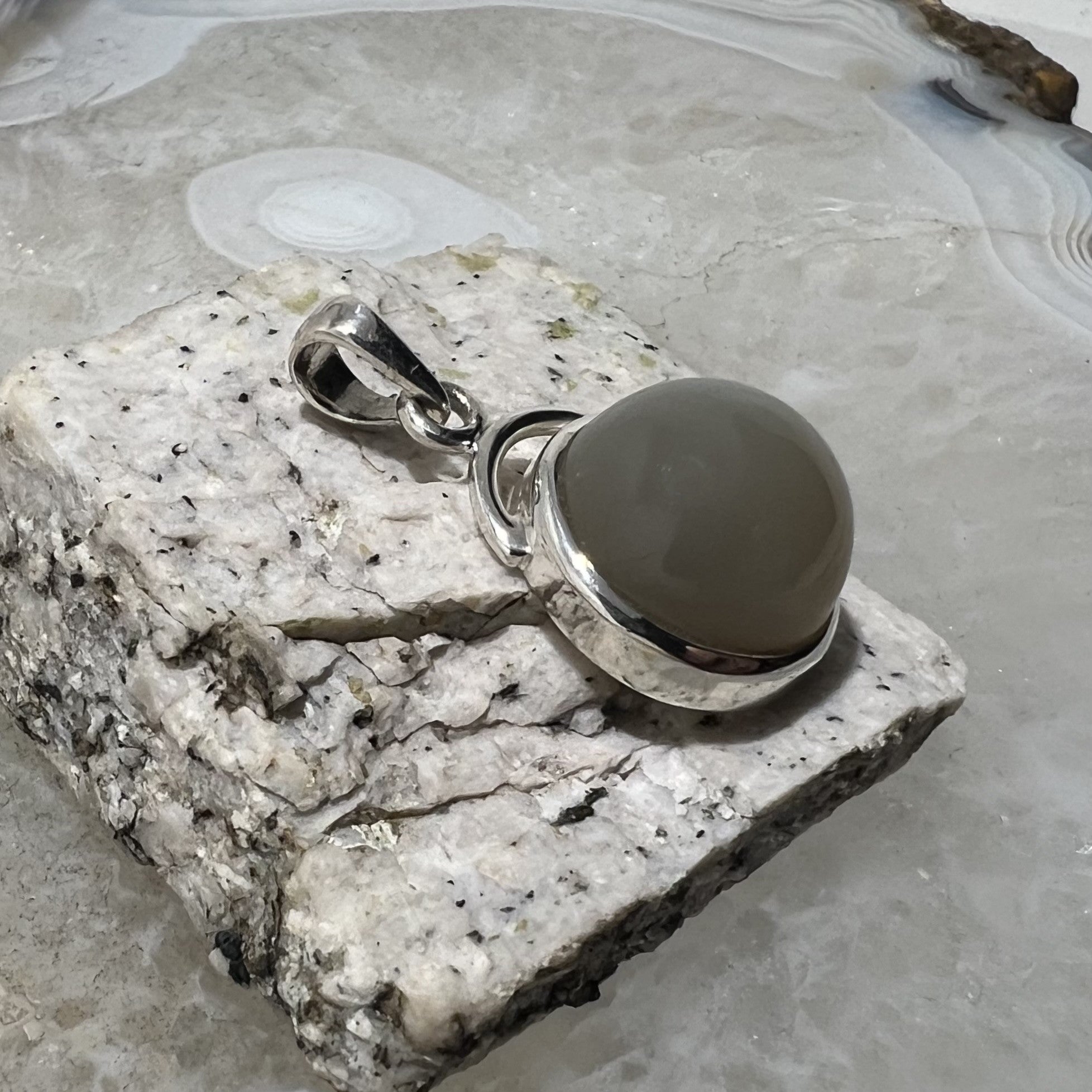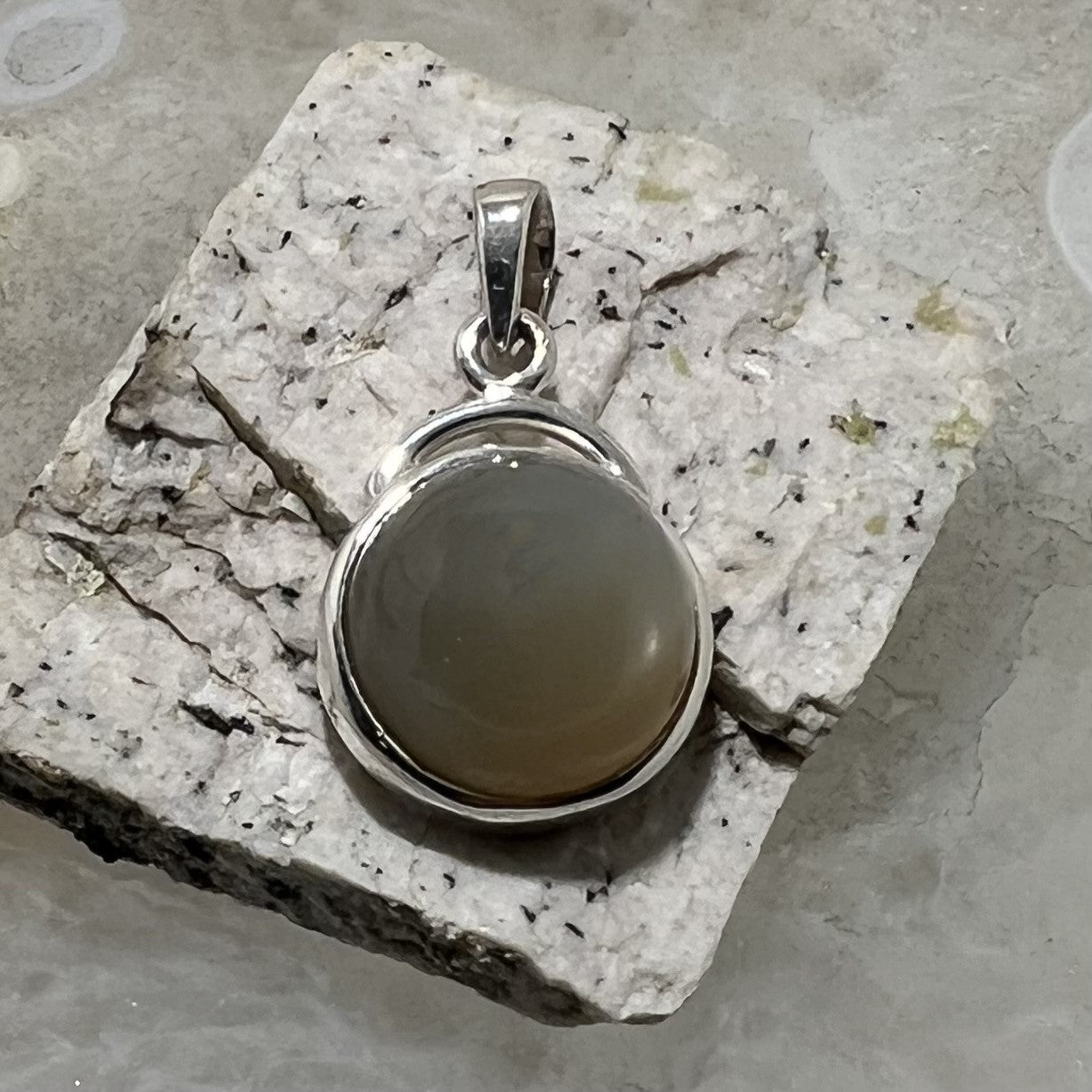 Timeless and quietly powerful, this round moonstone pendant is wrapped in 925 sterling silver, creating a graceful frame that highlights the stone’s soft, inner glow. The smooth cabochon catches light with a subtle, milky sheen—calming, luminous, and reminiscent of moonlight through mist. The silver wrap adds an artisan touch, giving the piece a sense of grounding elegance while allowing the stone itself to remain the centerpiece.
