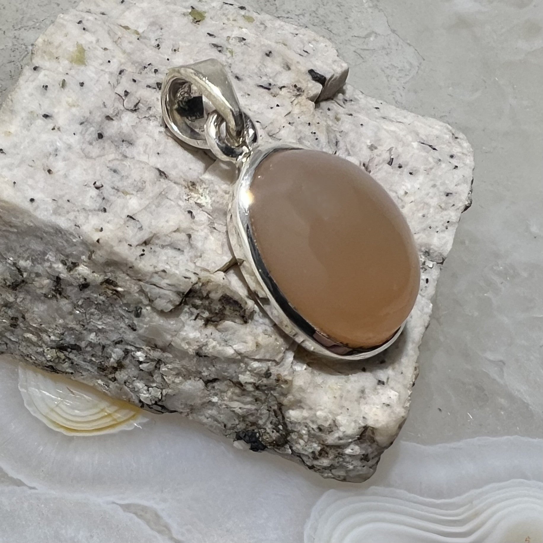 Warm and gently radiant, this oval peach moonstone pendant features a smooth cabochon set in simple, polished 925 sterling silver. Its soft, rosy glow carries a natural warmth—calming, nurturing, and subtly luminous, like the first light of dawn. The minimal setting highlights the stone’s soothing shimmer, giving the piece an elegant, understated presence that feels both comforting and refined.