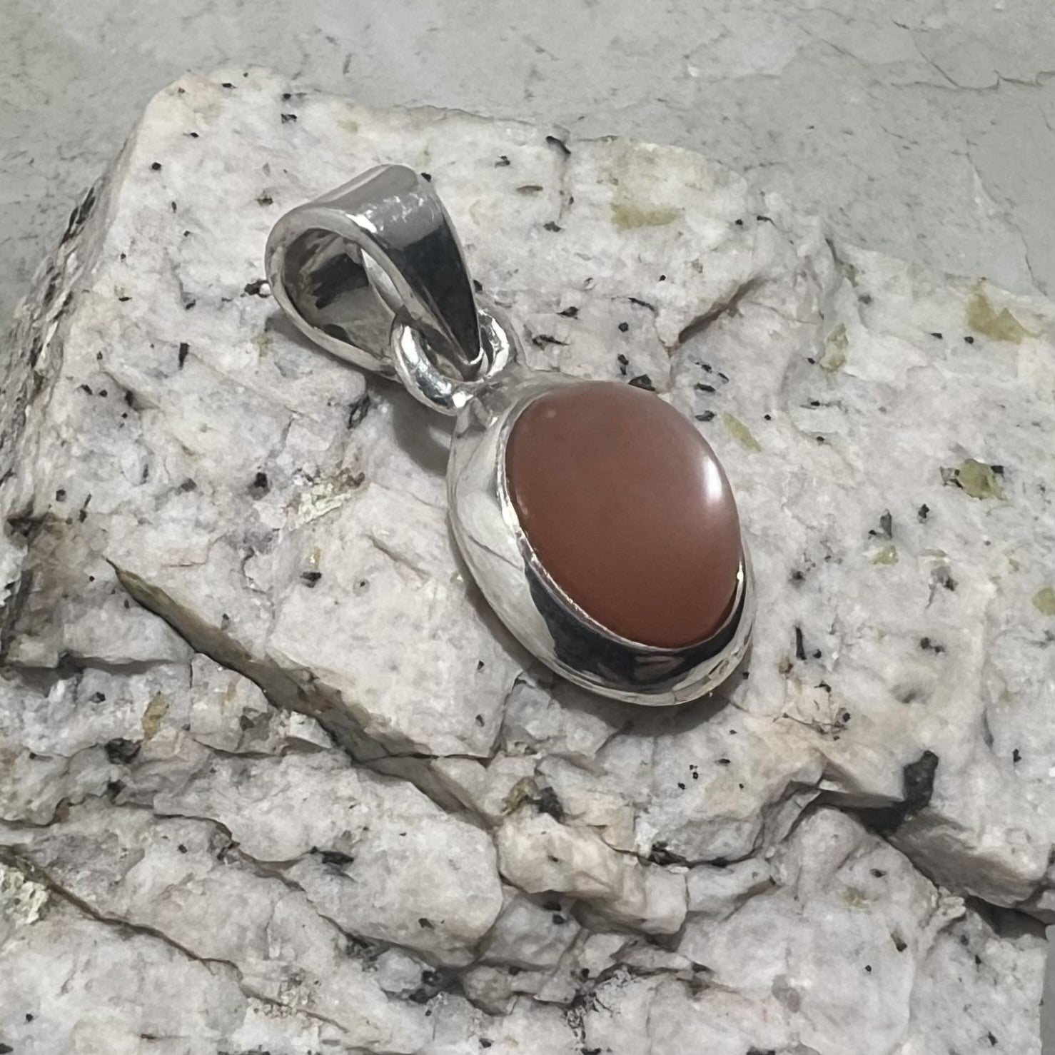 This dainty peach moonstone pendant features a petite cabochon set in polished 925 sterling silver. Its minimal design highlights the stone’s warm, gentle shimmer—subtle, nurturing, and effortlessly elegant. Light catches the moonstone with a quiet radiance, giving the piece a touch of warmth that feels intimate and refined, perfect for layering or wearing as a simple everyday talisman..